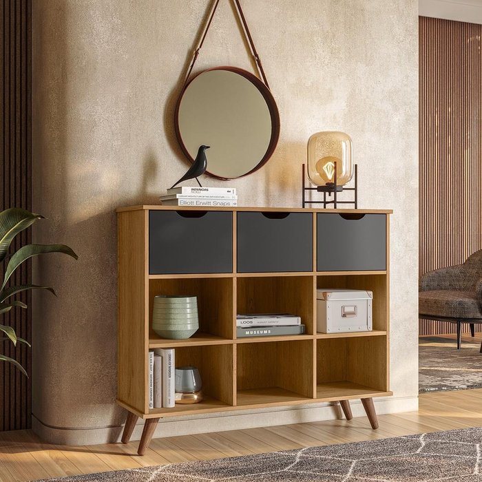 Nicho Organizador Retrô Freijó e 03 Gavetas Pretas Qmovi