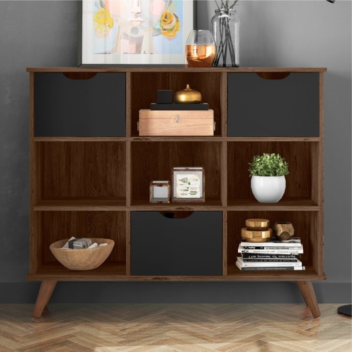 Nicho Organizador Retrô Yolanda Ébano Rústico com Gavetas Pretas