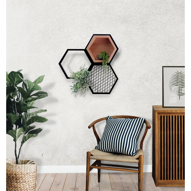 Conjunto de 3 colméias de aço, Estilo Industrial 60x58x12cm (LxAxP), com 1 nicho de MDF e um nicho com tela expandida.