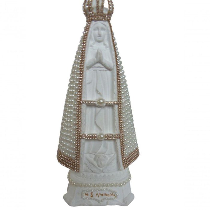 Imagem de Nossa Senhora Aparecida em Gesso, com aproximadamente 30 cm.Trabalhada com pérola e strass no manto.Imagem laqueada.Trabalho Artesanal.Altura: 30.00 cmLargura: 12.00 cmComprimento: 10.00 cmPeso: 1100 g