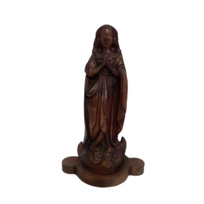 Essa linda imagem de Nossa Senhora Aparecida é produzida em madeira de araucária tratada e pintada manualmente, sendo a base pintada na cor prata. Possui 28 cm de altura e é uma obra Fac Símile, ou seja, é uma reprodução exata da edição original, com as mesmas dimensões e características da Imagem encontrada no Rio Paraíba do Sul em 1717, pelos três pescadores: João Alves, Felipe Pedroso e Domingos Garcia.
