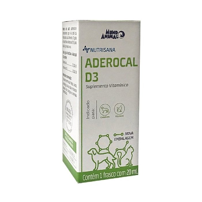 Nutrisana Aderocal D3 20ml - Mundo Animal ESPÉCIES Cães e Gatos APRESENTAÇÕES E CONCENTRAÇÕES - NutriSana Aderocal D3, frasco (20 mL) INDICAÇÕES Aderocal D3 gotas é de uso oral para animais domésticos. Pode ser administrado em casos de carências de nutrientes, em cães e gatos adultos ou filhotes. VIA(S) Oral FREQUÊNCIA DE UTILIZAÇÃO 24 / 24 horas DOSES Recomendado Cães e Gatos 1 gota / kg Orientações Conservar em local seco, fresco, ao abrigo da luz solar e fora do alcance de crianças e animais. Armazenar entre 15°C a 30°C. Não guardar o produto junto de alimentos, bebidas, produtos de higiene ou domésticos. Não reutilizar a embalagem vazia. Leia a bula ou informações descritas na embalagem. Foto Meramente ilustrativa. Descrição sob responsabilidade do fabricante, retirada diretamente do site do fabricante ou do próprio rótulo do produto. Caso haja diferença entre as informações aqui apresentadas e rótulo ou bula, prevalecerá sempre a informação do rótulo ou bula que acompanha o produto.