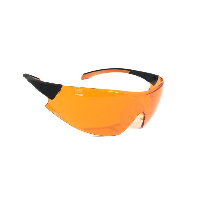 ÓCULOS DE SEGURANÇA, COM ARMAÇÃO E VISOR CONFECCIONADOS EM UMA ÚNICA PEÇA DE POLICARBONATO LARANJA (ALARANJADO), COM QUATRO PINOS LOCALIZADOS NA POSIÇÃO DO NARIZ, UTILIZADOS PARA O ENCAIXE DO APOIO NASAL DE MATERIAL PLÁSTICO MALEÁVEL. AS HASTES, DO TIPO ESPÁTULA, SÃO CONFECCIONADAS DE MATERIAL PLÁSTICO PRETO E LARANJA OU PRETO E VERDE E SÃO CONSTITUÍDAS DE DUAS PEÇAS: UM SUPORTE QUE POSSUI UMA ABERTURA EM UMA DAS EXTREMIDADES E QUE É FIXADO AO VISOR ATRAVÉS DE ENCAIXE E UMA HASTE, COM UMA DAS EXTREMIDADES FIXADA AO SUPORTE DESCRITO ANTERIORMENTE POR MEIO DE PARAFUSO METÁLICO.