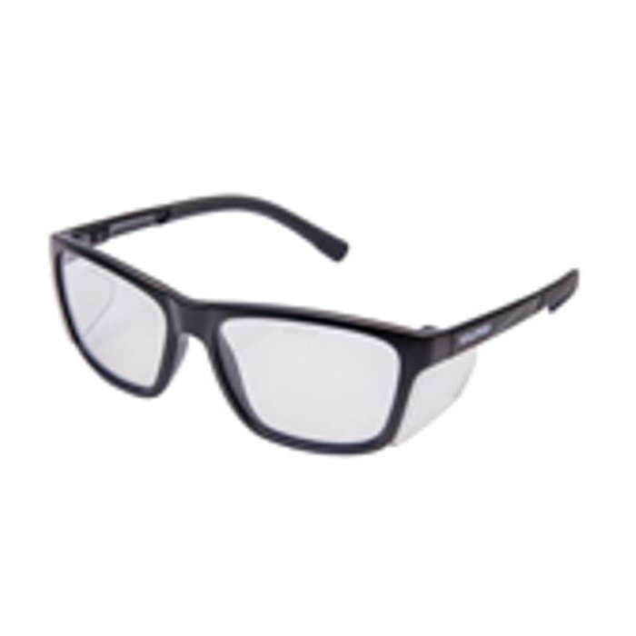 Óculos de segurança Kalipso Cancun CA 45873, constituídos de um arco de material plástico (Nylon), visor confeccionado em policarbonato, com proteção lateral acoplada à armação, hastes tipo espátula, confeccionadas do mesmo material da lente, com acabamento emborrachado nas pontas e articuladas na armação por meio de parafusos de aço inoxidável