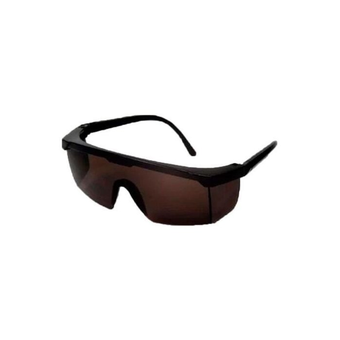 Óculos de segurança, constituídos de um arco de material plástico preto com um pino central e duas fendas nas extremidades utilizadas para o encaixe de um visor de policarbonato.