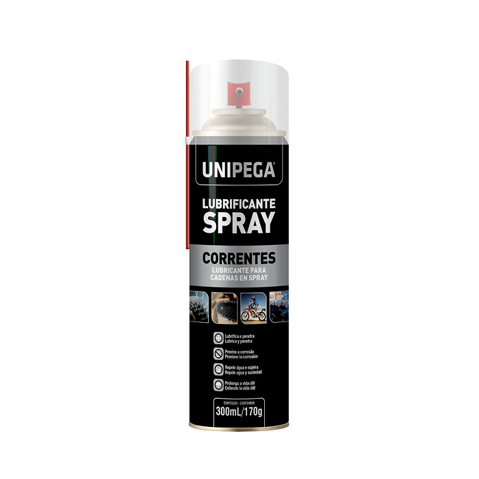 Lubrificante Spray para Correntes Unipega é um limpador de correntes e desengraxante, que forma uma espuma na superfície da corrente, penetrando profundamente e removendo rapidamente graxa e outras sujeiras. Tem uma formulação especial que evita os respingos ocasionados por lubrificantes convencionais. Pode ser aplicado em peças pintadas e envernizadas. Indicado para todos os tipos de correntes: bicicleta, moto, sistema de transmissão, portão automático, engrenagens industriais etc.