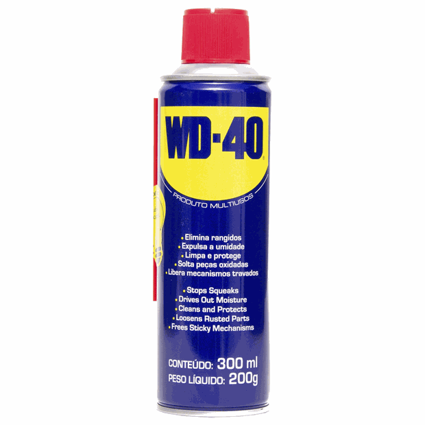 WD-40 Produto Multiusos 300 ml e 200g Embalagem Prática tem um formato que facilita o seu manuseio. Mais fina e mais alta, é mais fácil de pegar. Ideal para usar em casa, no trabalho, no carro, etc. Também possui válvula 180º exclusiva que permite o uso com a lata de cabeça para baixo Uso pertinente e natureza química Lubrificante e anticorrosivo multiuso/Derivados de petróleo.