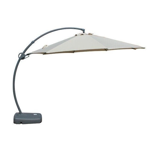 "Ombrelone Lateral para uso externo. Estrutura: em alumínio com pintura à pó cinza. Poste Ø60*1,8 mm; 8 varetas 22*13*1,0 mm. Acompanha base em polietileno de alta densidade, para ser preenchido com água (50 kgs) ou areia (75 kgs). Capa: cobertura de 3,5