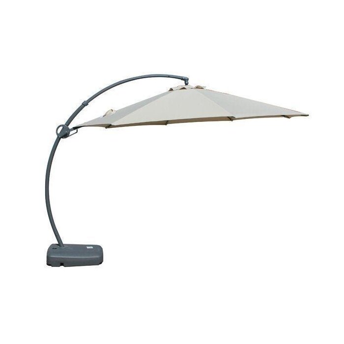 "Ombrelone Lateral para uso externo. Estrutura: em alumínio com pintura à pó cinza. Poste Ø60*1,8 mm; 8 varetas 22*13*1,0 mm. Acompanha base em polietileno de alta densidade, para ser preenchido com água (50 kgs) ou areia (75 kgs). Capa: cobertura de 3,5