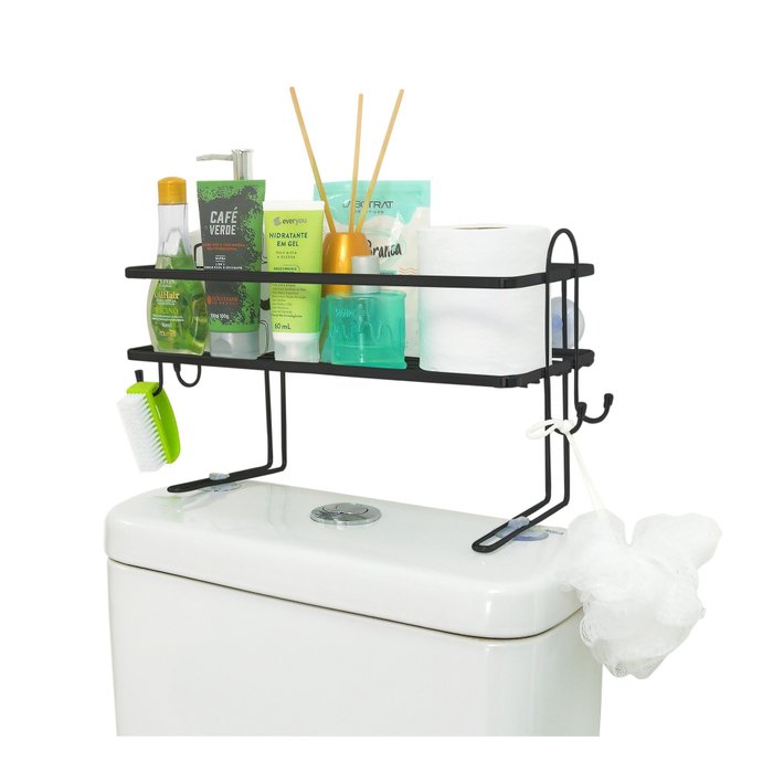 Organizador de banheiro multiuso, com espaço para todas as suas necessidades. E mais, contem 4 ganchos e ventosas para fixação. Item fabricado em aço epóxi preto, material de alta durabilidade e resistente a corrosão, perfeito para organizar banheiros. Produto inovador no mercado e com design que deixará seu banheiro mais bonito e organizado.