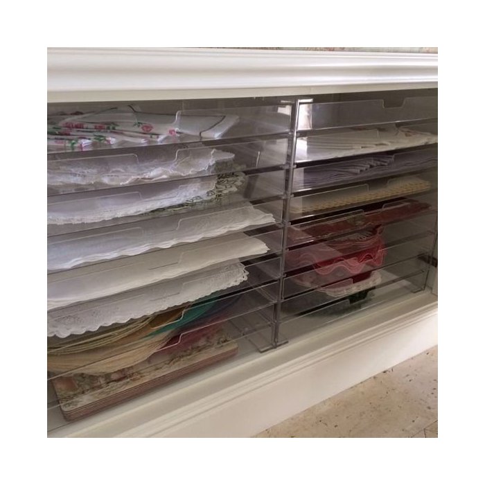 Organizador com 06 gaveteiros de formato retangular, em acrílico incolor, para uso como organizador de jogos americanos de jantar, guardanapos e acessórios , papelaria ou maquiagem. Nosso organizador de acrílico é confeccionado com fino acabamento e alta precisão de corte laser com tecnologia em qualidade agregando ainda mais qualidade e durabilidade nos nossos produtos, além da maior praticidade e todo o charme para acondicionar seus itens da melhor forma.