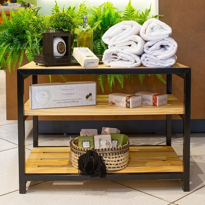Organizador de Banheiro com 3 Prateleiras em Ferro e Madeira Natural Ideal para organizar o espaço do banheiro, deixando cestarias, chinelos e itens para ser usado no ambiente. Um item ideal para sua casa, serve como banco e como sapateira. Além de ser super versátil ela tem um acabamento sofisticado. Conta com 3 prateleiras e acabamento sofisticado. Tamanho: Comprimento: 58cm Largura: 34,5cm Altura: 42cm Espaço entre as prateleiras: 12cm e 20cm Suporta até 150kg Sapatos e enfeites não acompanham a sapateira. A cor pode sofrer pequena alteração conforme seu monitor Não deixe o álcool ou produto de limpeza em contato com a madeira, ela irá manchar.