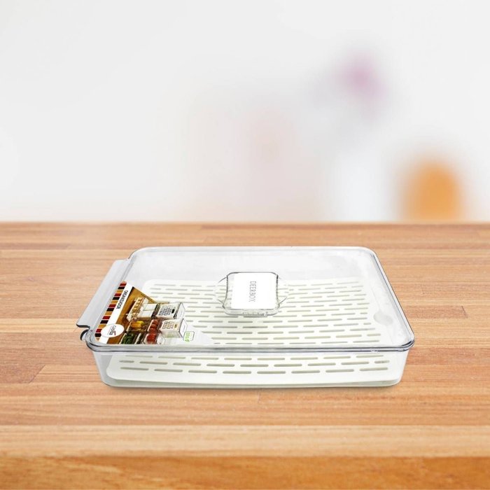 Capacidade: 2,5 litros, ideal para alimentos variados. Dimensões: 32,5 x 21 x 5,5 cm, perfeito para diferentes tamanhos de geladeiras. Escorredor interno: Facilita a lavagem e elimina líquidos acumulados. Respiradouro regulável: Garante ventilação adequada, prolongando a vida útil dos alimentos ao reduzir gases que aceleram a decomposição. Material resistente e seguro: Produzido com 90% PET e 10% PP, livre de BPA, atóxico e sem transferência de odores ou sabores. Alta resistência: Suporta temperaturas de até 150°C, oferecendo durabilidade e praticidade. Design transparente e brilhante: Proporciona uma visualização clara do conteúdo, além de trazer elegância à organização.