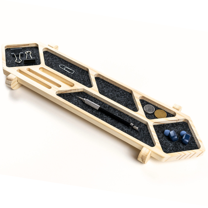 Este organizador combina elegância e funcionalidade, trazendo sofisticação e praticidade ao seu dia a dia. Seu design retangular apresenta compartimentos específicos para óculos, chaves, canetas e outros itens essenciais, com revestimento de feltro cortado a laser para proteção impecável.
