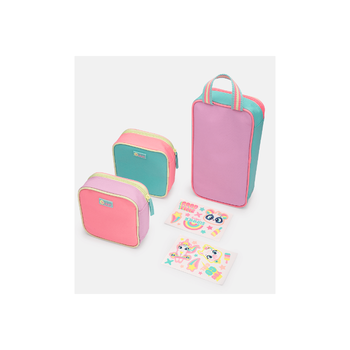 Kit com 3 organizadores de mala em nylon, com parte frontal dos itens em PVC colorido e transparente.