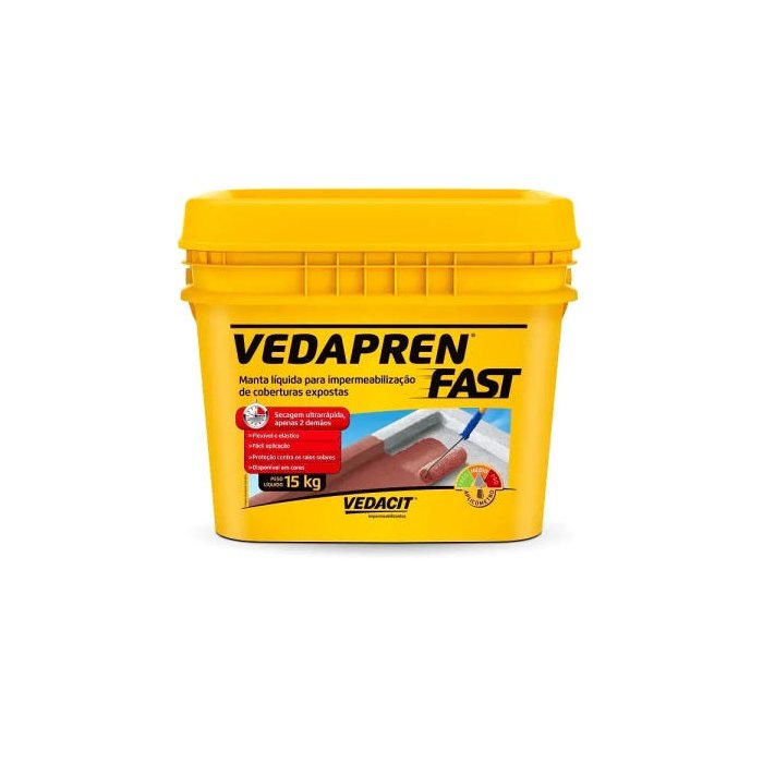 VEDAPREN FAST é uma manta líquida, de base acrílica, secagem ultrarrápida e aplicação a frio sem emendas, pronta para uso e moldada no local. Com alto rendimento, cobre a estrutura com uma proteção impermeável e apresenta ótimas características de elasticidade, flexibilidade e aderência, tendo uma grande durabilidade e alta resistência a intempéries. Proporciona um excelente acabamento, além de refletir os raios solares, o que reduz parte do calor absorvido pela estrutura. VEDAPREN FAST dispensa proteção contra os raios solares.
