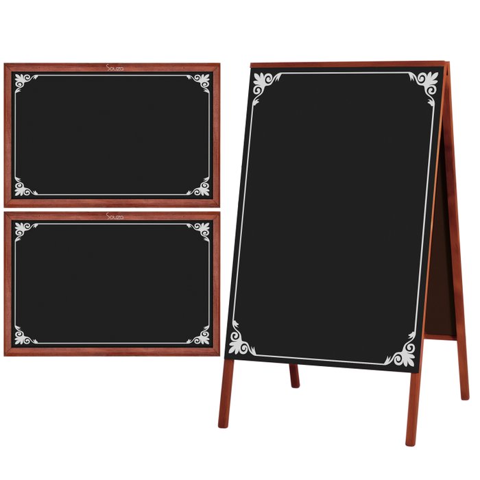 Pack Placa Lousa Quadro Cavalete Propaganda Comércio Dupla Face Madeira Mogno 85x50 cm Preto Fosco ou Preto Fosco Decorado - Ideal para cardápio de restaurantes, bares, cafeterias, padarias, lanchonetes supermercados açougues, O cavalete é apaptavel a divesos tipos de comércios. O quadro negro fosco destaca bem o giz branco e os coloridoses. A moldura em mogno tem um apelo de maior sobriedade e sofisticação combinando com as áreas gourmet.