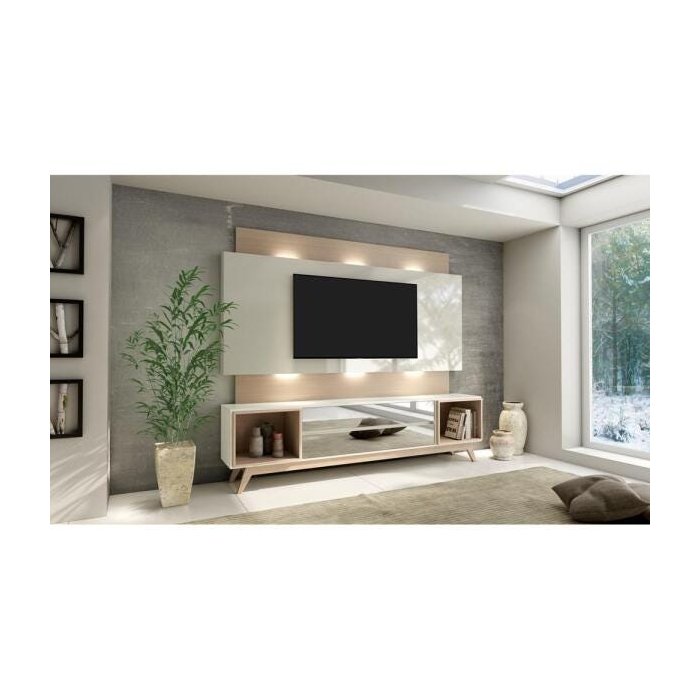 Painel 220cm + Rack com 2 Gavetas Espelhadas + LED - Dalla Costa - Off White/Natural