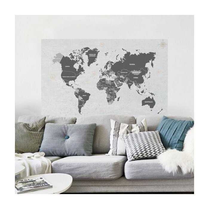 Painel Adesivo Mapa Mundi. O efeito do painel fotográfico de parede na decoração é algo incomparável. Tenha um ambiente mais bonito, aconchegante, charmoso e com personalidade com nossos Painéis Adesivos. Tamanhos disponíveis: 0,95 x 1,74m - 1 rolo de 0,58 cm x 3,00m de comprimento. 1,16 x 1,90m - 2 rolos de 0,58 cm x 2,00m de comprimento. Acompanha Manual de Instruções. Adesivo de alta qualidade com acabamento fosco liso, não apresenta relevo ou textura. Não possui moldura. Produto autoadesivo, dispensa uso de cola e é de fácil aplicação. Você pode colar em superfícies lisas como: Paredes de massa corrida, gesso, tinta acetinada, látex e acrílica. Limpeza e Conservação Antes de colar: Limpe o local com pano seco para retirar poeira e impurezas. Depois de colado: Pano macio umedecido em água e detergente neutro (não utilize abrasivos ou produtos com solvente). Obs: O tom da cor do material pode variar da cor vista na tela devido a configuração de cores do seu monitor. Veja o tamanho do desenho Veja como é fácil colar