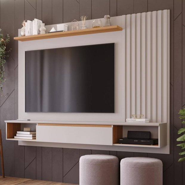 Características - Fabricação MDF 15/25mm - 1 Prateleira - 2 Nichos - Detalhe decorativos ripado / tampo chanfrado - 1 Porta tipo basculante - Recomendado para TV LCD/LED de até 65" Produzido nas cores NATURE/OFF WHITE e OFF WHITE/NATURE - Dobradiças metálica / montagem feita com parafusos-cavilhas-minifix Dimensões - Altura: 157cm - Largura: 215,2cm - Profundidade: 36,3cm - Peso: 65kg Garantia - 6 meses Importante - As Imagens são meramente ilustrativas. Os demais itens e objetos de decoração não acompanham o produto. - Todos os móveis possuem manual de montagem, você pode montar ou escolher um montador de sua confiança. - Confira as dimensões deste produto e certifique-se de que passará normalmente por elevadores, portas, escadas e/ou corredores de sua moradia. Bem como sua acomodação. - Em caso de divergência, o preço válido é o do Carrinho de Compras. - Preços e condições válidas somente para compras via Internet. - Em prédios que não possuem elevador de carga, as mercadorias serão entregues pela escada até o 4º (quarto) andar.