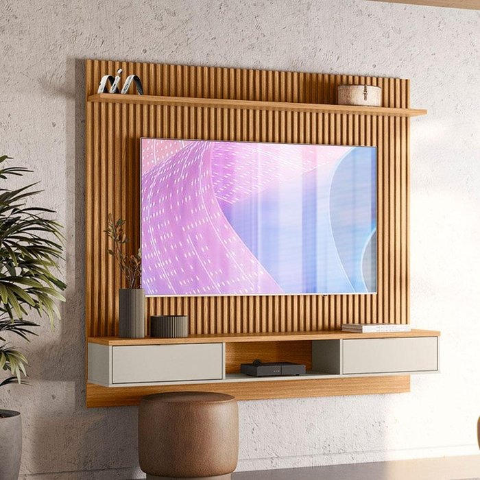 Este suporte acomoda TVs de até 75 polegadas com elegância e praticidade. Com 2 portas basculantes, combina funcionalidade e design de forma inteligente, oferecendo espaço para dispositivos e acessórios. Um complemento perfeito para a sua experiência de entretenimento.- Produzido em MDP/MDF- Prateleira em MDP- Detalhes ripados em MDF- Suporta tvs de até 75 polegadas- Possui passa-fios para melhor organização- 2 portas basculantes- Puxadores em alumínioDimensões do produto: Largura 180 cm; Profundidade 33 cm; Altura 132 cm; Itens Inclusos: 1 painel e 1 nichoComplexidade da montagem: Média, pode ser montado por apenas uma pessoa e/ou necessite de maior conhecimento para montagem.Recomendações de uso, manutenção e limpeza: Limpar com flanela ou pano macio seco, não utilizar produtos abrasivos, desengordurantes, álcool ou solvente. Não expor o produto diretamente a luz solar e à umidadeGarantia: 3 mesesOBS: Foto meramente ilustrativa, objetos, utensílios e decoração não fazem parte do produto.Manual De Montagem E Instalação Do PainelManual De Montagem E Instalação Do Nicho