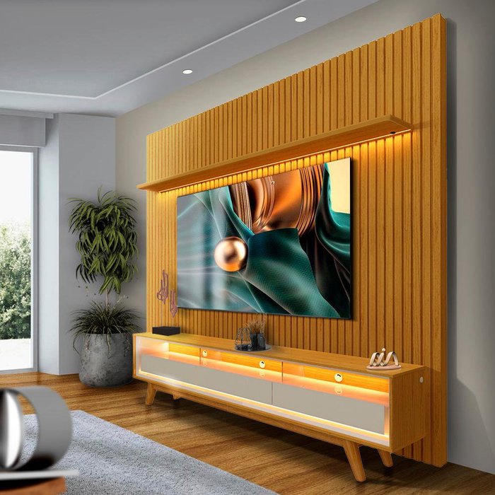 Dimensões do Painel: Largura 228,8 cm; Profundidade 35,5 cm; Altura 250 cm;Dimensões do Rack: Largura 211,4 cm; Profundidade 34,8 cm; Altura 58 cm;Itens Inclusos: 1 Painel e 1 Rack- Painel 100% MDF- Painel com ripas autênticas- Led em lux quente com difusor- Design moderno- Prateleira chanfrada com bordas laqueadas (pode ser instalada tanto na parte superior quanto inferior)- Painel com medida de 2.30 suporta tvs de até 85 polegadas- 3 gavetas chanfradas com corrediças telescópicas- Rack contando com 2 opções de pés, em madeira maciça ou rodízios- Divisórias em vidro de 8mm- Produto com acabamento atóxicoComplexidade da montagem: Média, pode ser montado por mais de uma pessoa e/ou necessite de maior conhecimento para montagem.Recomendações de uso, manutenção e limpeza: Limpar com flanela ou pano macio seco, não utilizar produtos abrasivos, desengordurantes, álcool ou solvente. Não expor o produto diretamente a luz solar e à umidadeGarantia: 3 meses