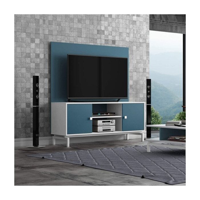 Painel com Rack para TV até 60 Polegadas 2 Gavetas e Nichos Xadrez Contemporâneo Bortolini Móveis Azul/Branco