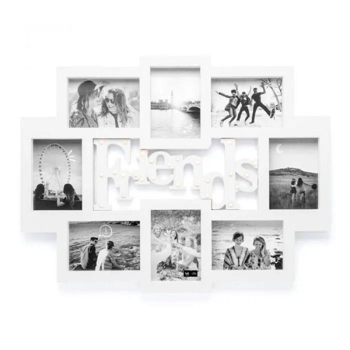 DESCRIÇÃO DO PRODUTO Amizade colorida, amizade divertida, amizade pra toda hora. Uma amizade merece um lugar especial não só no coração, mas na decoração da casa também, né? Este painel de fotos vem exatamente pra isso. Um presente criativo para marcar a amizade com as fotos mais legais entre amigos e amigas. Além de comportar 8 fotos 17x12cm, o painel tem LED pra deixar o clima de casa mais especial, com uma luz ambiente de leve, deixando a amizade ainda mais em evidência. Disponível na cor branca. CARACTERÍSTICAS DO PRODUTO Largura: 73 cm Altura: 56 cm Capacidade: 8 FOTOS 17X12 cm Matéria-prima: Plástico, vidro e componentes eletrônicos. IMPORTANTE SABER Contém 1 painel com LED para 8 fotos 17x12cm. Utilizar 2 pilhas AA (não inclusas). Limpar com pano seco. Teme químicos e abrasivos.
