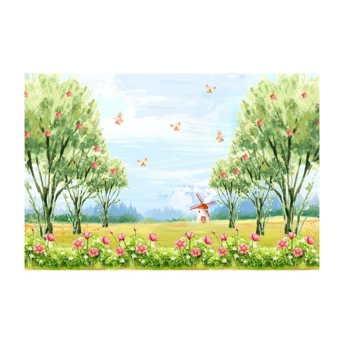 Painel de Tecido Sublimado Jardim e Moinho de Vento Aquarela