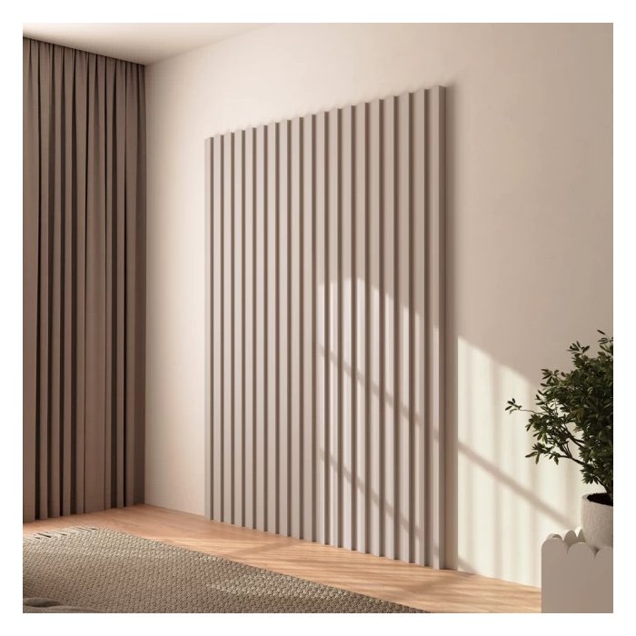 - Cada painel é composto por uma chapa de MDF de 9mm e 6 ripas de 15mm que já vem presas a chapa;