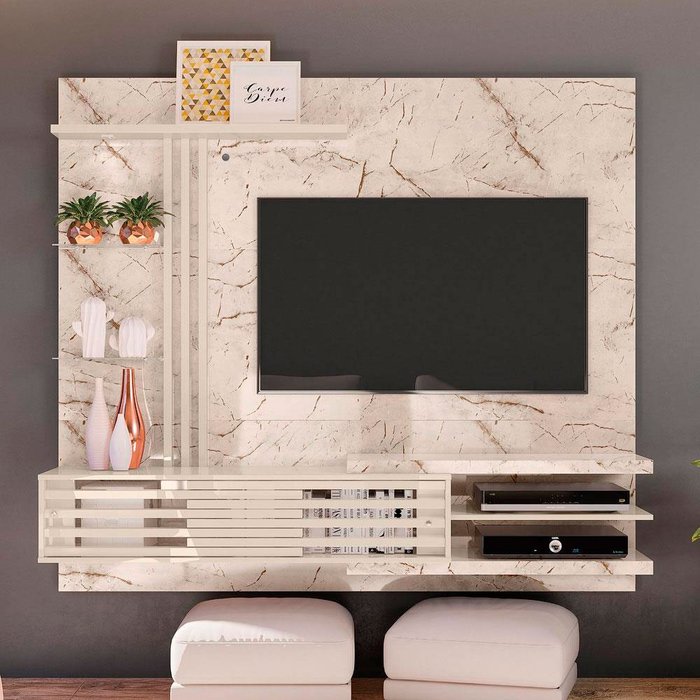 Cheio de estilho, ele conta com 2 portas deslizantes frisadas que se sobrepõe, 2 prateleiras de vidro para objetos decorativos e nichos para instalar outros aparelhos eletrônicos ou guardar seus itens. Opa...além da luminária de led que dá um toque todo especial para o painel, deixando sua sala de estar ainda mais charmosa.