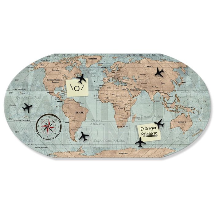 PAINEL MURAL MAGNETICO EM ACO DECORATIVO VIAGEM MAPA MUNDI COM IMA 43X85CM