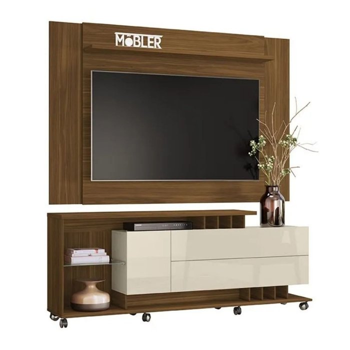 Painel Mobler Nobre Extensivo 4004031-715 Painel para televisão, ideal para quem busca modernidade e sofisticação ao ambiente. Produzido com alto controle de qualidade, estrutura 100 em MDP, contando com pintura em acabamento UV. Composto por uma prateleira externa de 25mm, passa fio organizador e espaço para TV de até 55 polegadas. Por ser um móvel extensível pode ser montado conforme o tamanho da sua sala. Esse móvel chegará em sua casa separado em 01 volume. Características: Espaço para TV de até 55. Cunha de fixação dos painéis; Passa fio organizador; Prateleira superior de 25mm; Dimensões Altura: 121 cm Largura: 150 cm, 162 cm ou 180 cm Profundidade: 21 cm Peso: 31,15 Bancada Mobler Verona 1,80 1005103-716 A BancadaVerona foi desenvolvida para trazer mais charme e modernidade para seu ambiente de sala de estar. Além de oferecer espaço para televisor e objetos de decoração, a BancadaVerona garante muita elegância para a sala. Características: Espaço para TV de até 55#8243; Cunha de fixação dos painéis Passa fio organizador Prateleira superior de 25mm Porta basculante com pistão a gás Tampo de 25mm Portas em MDF sendo a maior com friso decorativo Rodízios 1 Porta convencional Prateleira de vidro 6mm Dimensões: Altura: 71 cm Largura: 180 cm Profundidade: 36 cm Peso: 42,4 Garantia: 3 meses.