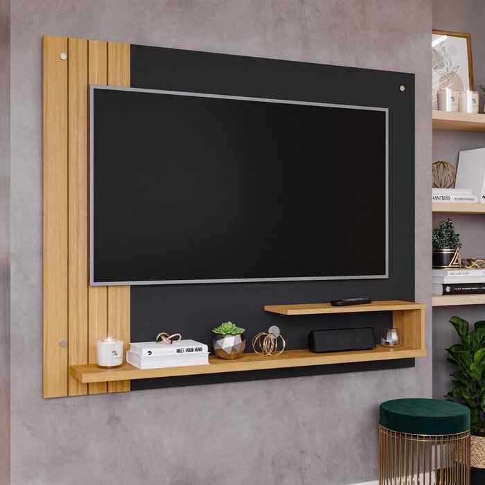 Painel Para TV 50 Polegadas Sala Quarto 135cm Preto Cinza Chumbo Nature 2 Prateleiras Home Dunas