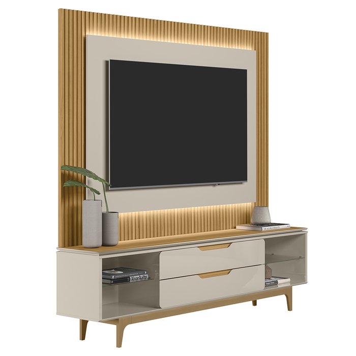 Descubra a experiência do luxo e da elegância com o conjunto de Painel Para TV 70 Pol Real e Rack Bancada 220cm Lola L06 Tauari/Off White, da Mpozenato.