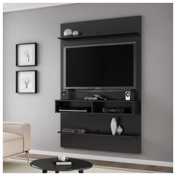 Lindo e resistente painel, com 2 prateleiras e nichos, uma excelente escolha para acomodar objetos decorativos e aparelhos eletrônicos. Elaborado em mdp 15 mm que garante resistência e durabilidade ao móvel.