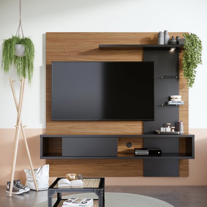 Painel para TV até 55 Polegadas 3 Prateleiras 2 Nichos Atlântico Colibri Móveis Noce Milano/Preto Fosco