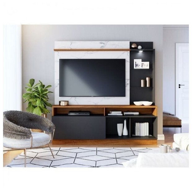 Painel para TV até 60 Polegadas 4 Nichos 3 Prateleiras 1 Porta com LED Leblon Colibri Noce Milano/Calacatta/Preto Fosco