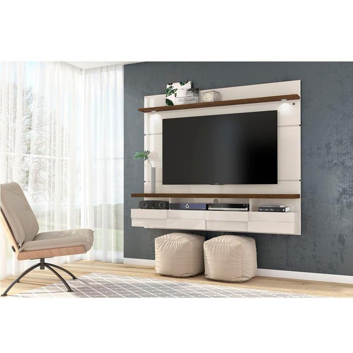 Painel para Tv até 60 Polegadas Bancada Suspensa Lana 1.8 2 Portas com Luminária de Led Cor Off Off White com Savana
