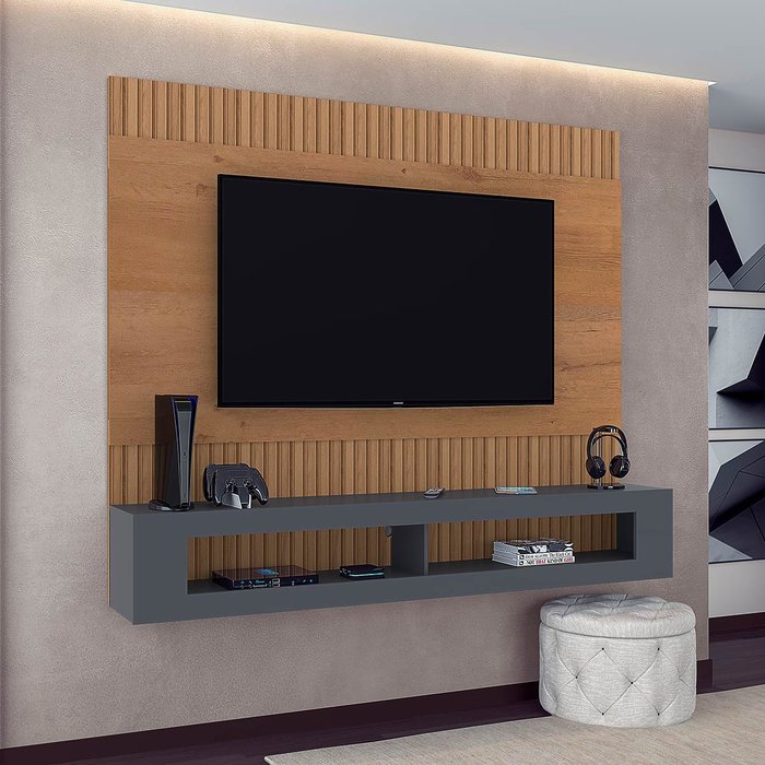 Painel para TV até 65 Pol Ripado 183 x 154 Cm San Diego MDP Canelato Grafite - ClickLar Canelato Rústico e Grafite