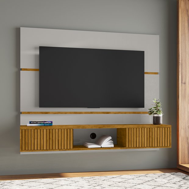 O Painel Âmbar é ideal para sua sala. Com designer moderno e muito funcional ele conta com amplo tampo e nicho central que comportam perfeitamente os mais variados tipos de objetos de decoração, bem como aparelhos eletrônicos. Possui duas portas com dobradiças metálicas e amplo espaço interno. A configuração com colunas e barras traseiras de 15mm possibilita a instalação oculta de cabos e fios, que podem ser transpassados à TV e demais equipamentos, na frente do painel. Seu tampo é elaborado em MDP de 25mm, demais componentes da estrutura em MDP de 15mm, garantindo qualidade e resistência ao produto. Com amplo espaço livre no painel ele comporta TVs de até 65 polegadas.