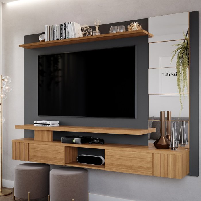Painel para TV até 65 Polegadas 2 Portas 3 Prateleiras Espelhado Chorme Espresso Móveis Grafite/Nature