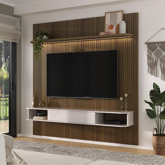 Esse painel é perfeito, testado para suportar com segurança uma TV de até 75 polegadas, para você que precisa de um suporte de qualidade para sua televisão e agradável porque confere beleza e modernidade ao ambiente. Possui detalhes usinado de baixo relevo na porta e pintura 3D no acabamento ripado. Possui uma prateleira perfeita para armazenar objetos decorativos, livros, plantas artificiais e aparelho de TV. Contém fita de led embutida embaixo da prateleira. Material em MDP /MDF 15mm com pintura UV proporcionando mais resistência e durabilidade do produto. Dimensão do Painel: Altura: 183 cm Largura: 182,5 cm Comprimento: 33 cm Informações do Produto: Cor: Pinho Ripado/Off White. Portas: Sim (1) Prateleira: Sim (1) 25mm espessura Passa Fio: Sim (1) Nichos: Sim (2) Fita de Led embutida embaixo da prateleira. Material Principal MDP/MDF 15mm Pintura 3D no acabamento ripado Pintura UV texturizada Itens Inclusos: 1 Painel Manual de Montagem Kit completo para montagem e manual de instruções Garantia: 3 meses contra defeito de fabricação Informações Adicionais: - Fotos meramente ilustrativas do produto no ambiente. - Os objetos que ambientam as fotos não acompanham o produto; - Verificar descrição e tamanho do produto antes da compra. - Avaliar a mercadoria no ato do recebimento e recuse em caso de divergência ou avarias. - Mantenha as informações de contato e endereço de entrega atualizados para entrarmos em contato caso necessário. - Limpar com flanela ou pano macio seco, não utilizar produtos abrasivos, desengordurantes, álcool ou solvente. Não expor o produto diretamente à luz solar e à umidade. * Sugerimos a contratação de um montador profissional para a montagem do produto. Não nos responsabilizamos por avarias causadas no ato da montagem. * Não nos responsabilizamos pela montagem e desmontagem do produto no ato da entrega e devolução, assim como os custos gerados nestas situações. * A transportadora entregará o produto no andar térreo do endereço de entrega. * Não nos responsabilizamos por subir escadas, corredores e elevadores ou transporte por guincho em apartamentos.