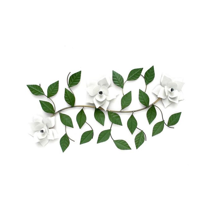 Arranjo de parede artesanal de ferro com flores e folhas de lata.
