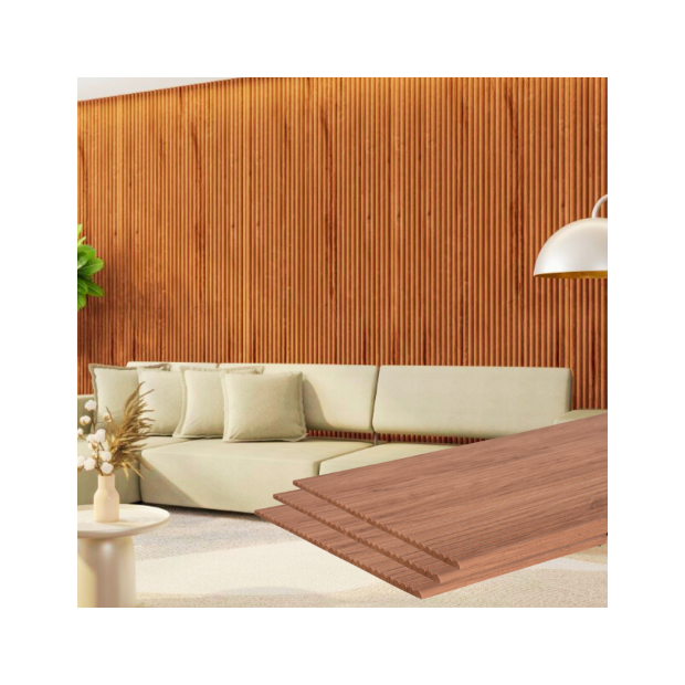 Produto de alta tecnologia e de fácil aplicação. Por ser produzido em MDF e PET reciclável, é um produto 100% ambientalmente correto e sustentável. Indicado para uso em ambientes internos. Imagem podem sofrer alterações devido a tela. Caso tenha dúvidas solicite mostruário. Vendido em caixas com 4 painéis sendo cada painel com 2,75m de comprimento x 44cm de largura, totalizando 4,9m2 por caixa. Teme umidade e temperaturas muito altas.