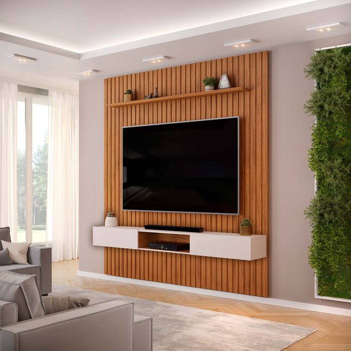 Painel Ripado com Bancada Suspensa para TV até 75 Polegadas 250 Trento Freijó/Off White - DJ Móveis