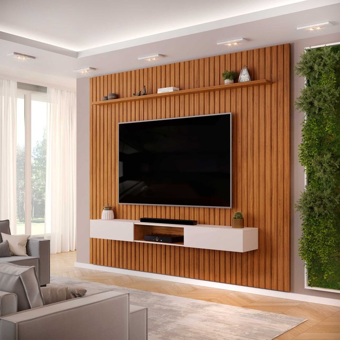 Painel Ripado com Bancada Suspensa para TV até 75 Polegadas 275 Trento Freijó/Off White - DJ Móveis