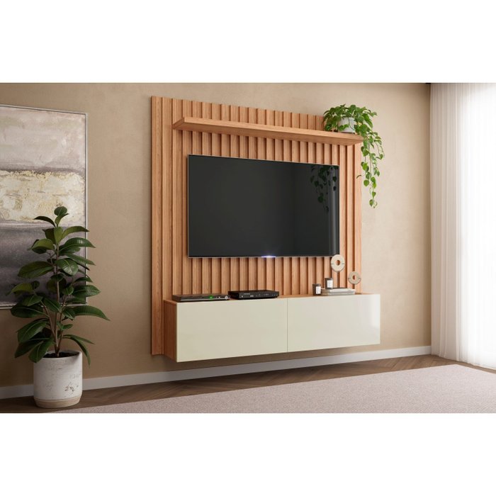 Painel Ripado para TV até 65 Polegadas 2 Portas Basculante 178cm Pradel Móveis Freijó/Off White