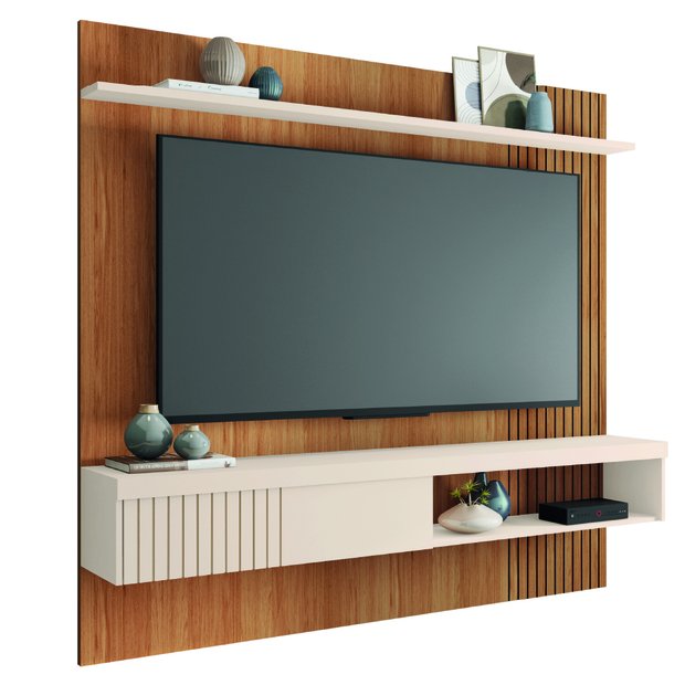 Painel Ripado para Tv até 65 Polegadas com Prateleira e Nicho Manu Madeirado/off White Caemmun Freijó/Off White