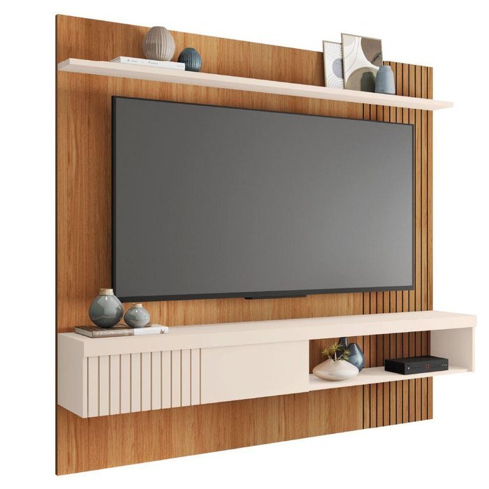 Painel Ripado para Tv até 65 Polegadas com Prateleira e Nicho Manu Madeirado/off White Caemmun